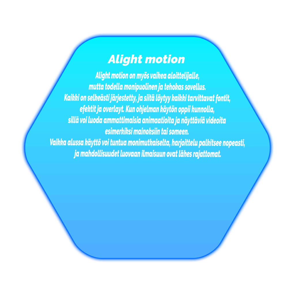 Alight motion on myös vaikea aloittelijalle, mutta todella monipuolinen ja tehokas sovellus. Kaikki on selkeästi järjestetty, ja siitä löytyy kaikki tarvittavat fontit, efektit ja overlayt. Kun ohjelman käytön oppii kunnolla, sillä voi luoda ammattimaisia animaatioita ja näyttäviä videoita esimerkiksi mainoksiin tai someen. Vaikka alussa käyttö voi tuntua monimutkaiselta, harjoittelu palkitsee nopeasti, ja mahdollisuudet luovaan ilmaisuun ovat lähes rajattomat.