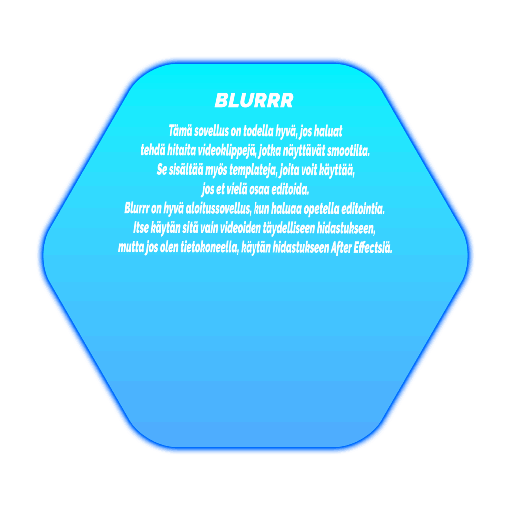 Tämä sovellus on todella hyvä, jos haluat tehdä hitaita videoklippejä, jotka näyttävät smootilta. Se sisältää myös templateja, joita voit käyttää, jos et vielä osaa editoida. Blurrr on hyvä aloitussovellus, kun haluaa opetella editointia. Itse käytän sitä vain videoiden täydelliseen hidastukseen, mutta jos olen tietokoneella, käytän hidastukseen After Effectsiä.