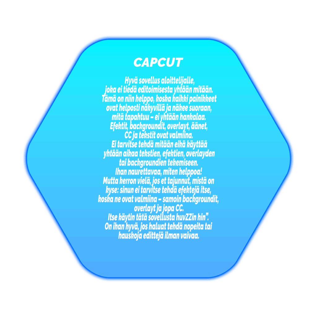 Hyvä sovellus aloittelijalle, joka ei tiedä editoimisesta yhtään mitään. Tämä on niin helppo, koska kaikki painikkeet ovat helposti näkyvillä ja näkee suoraan, mitä tapahtuu – ei yhtään hankalaa. Efektit, backgroundit, overlayt, äänet, CC ja tekstit ovat valmiina. Ei tarvitse tehdä mitään eikä käyttää yhtään aikaa tekstien, efektien, overlayden tai backgroundien tekemiseen. Ihan naurettavaa, miten helppoa! Mutta kerron vielä, jos et tajunnut, mistä on kyse: sinun ei tarvitse tehdä efektejä itse, koska ne ovat valmiina – samoin backgroundit, overlayt ja jopa CC.