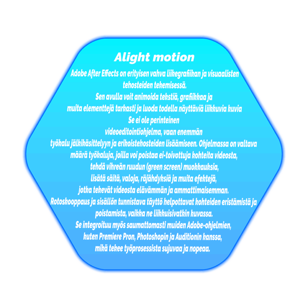 Adobe After Effects on erityisen vahva liikegrafiikan ja visuaalisten tehosteiden tekemisessä. Sen avulla voit animoida tekstiä, grafiikkaa ja muita elementtejä tarkasti ja luoda todella näyttäviä liikkuvia kuvia. Se ei ole perinteinen videoeditointiohjelma, vaan enemmän työkalu jälkikäsittelyyn ja erikoistehosteiden lisäämiseen. Ohjelmassa on valtava määrä työkaluja, joilla voi poistaa ei-toivottuja kohteita videosta, tehdä vihreän ruudun (green screen) muokkauksia, lisätä säitä, valoja, räjähdyksiä ja muita efektejä, jotka tekevät videosta elävämmän ja ammattimaisemman.