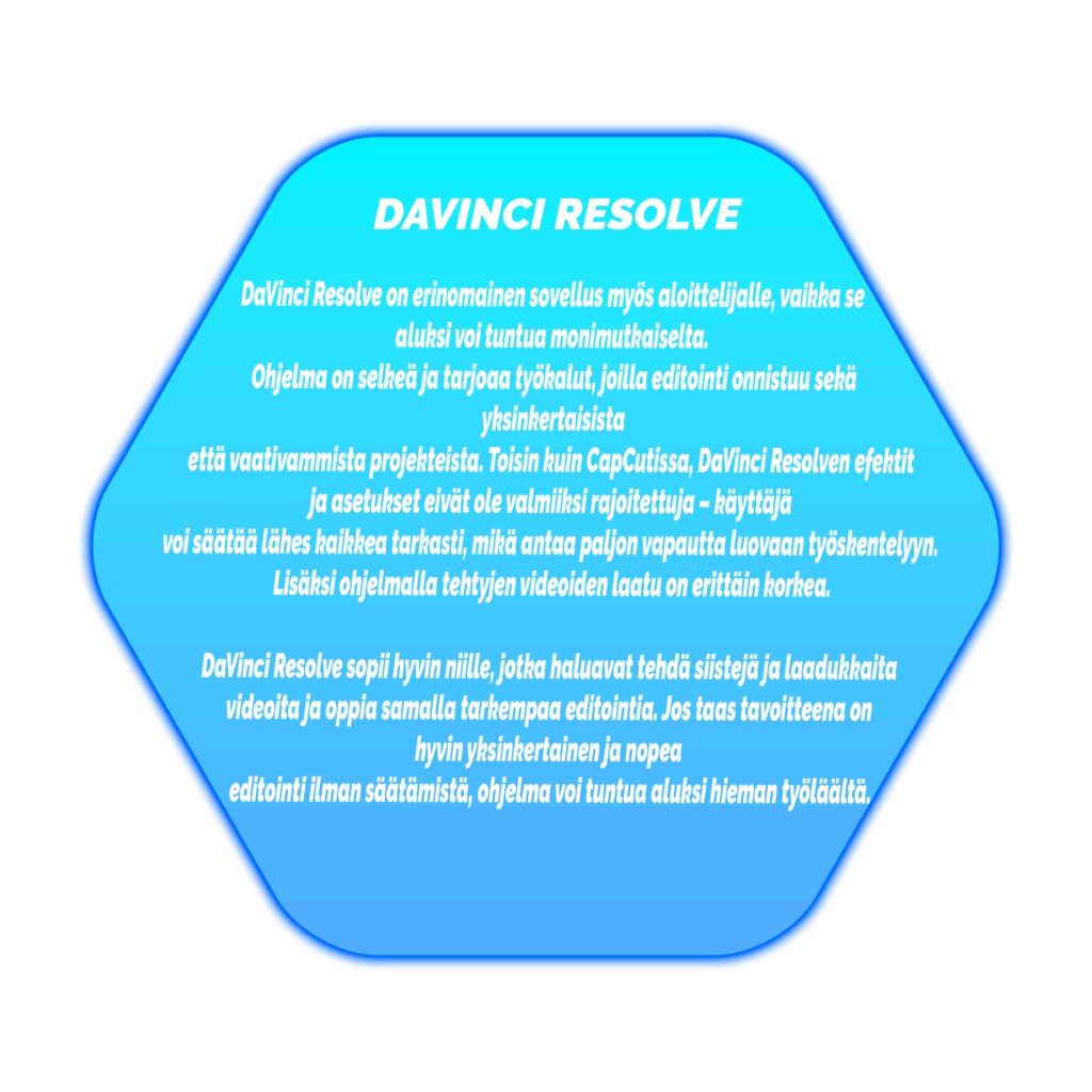 DaVinci Resolve on erinomainen sovellus myös aloittelijalle, vaikka se aluksi voi tuntua monimutkaiselta. Ohjelma on selkeä ja tarjoaa työkalut, joilla editointi onnistuu sekä yksinkertaisista että vaativammista projekteista. Toisin kuin CapCutissa, DaVinci Resolven efektit ja asetukset eivät ole valmiiksi rajoitettuja – käyttäjä voi säätää lähes kaikkea tarkasti, mikä antaa paljon vapautta luovaan työskentelyyn. Lisäksi ohjelmalla tehtyjen videoiden laatu on erittäin korkea.